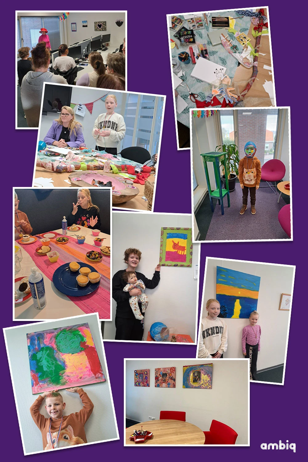 Tijdens de middag kregen de kinderen, jongeren en andere gasten een rondleiding langs alle kunstwerken. Ze luisterden aandachtig naar de verhalen achter de kunst en werden door directeur Ina Kuipers tijdens een kort praatje aangemoedigd om trots te zijn op hun eigen werk. Na de kunsttour konden ze deelnemen aan allerlei leuke activiteiten: zo werden er taartjes versierd, werd er geschilderd en samen spelletjes gespeeld.